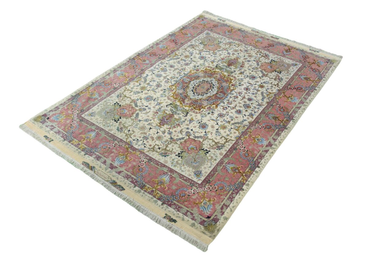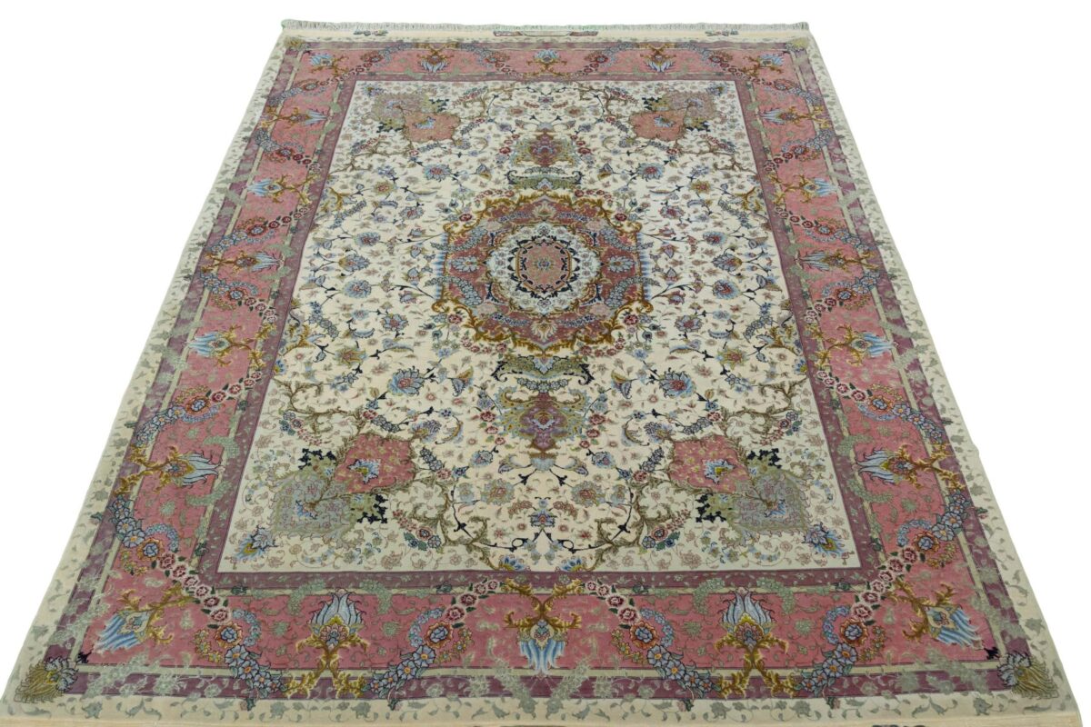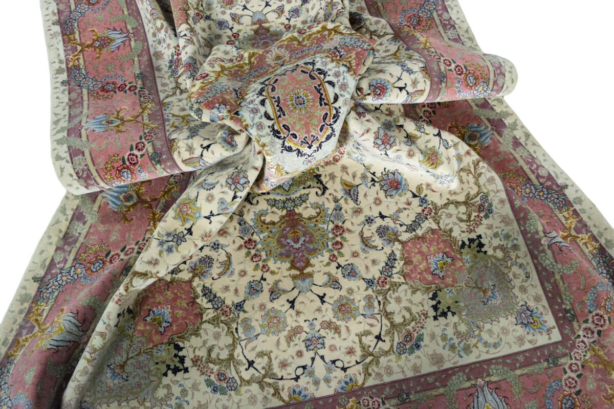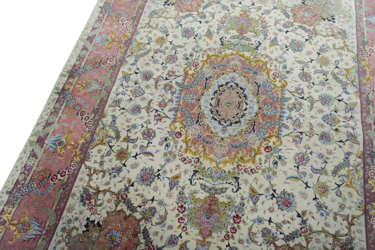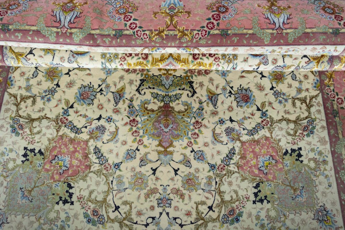 Für die besondere Eleganz des Täbriz-Flors sorgen hervorragende Materialien wie samtig anmutende Korkwolle und glänzende Seidenfäden. Die Knüpfqualität eines Täbriz-Teppichs lässt sich aus der angegebenen Raj-Zahl erschließen – je höher diese ausfällt, umso feiner ist die Knüpfdichte, die eine Million und mehr Knoten pro Quadratmeter erreichen kann. Bei besonders feingeknüpften Qualitäten kommt für die Kette statt des üblichen Baumwollgarns sogar Seide zum Einsatz.