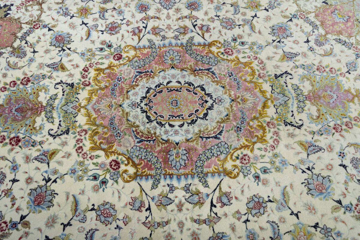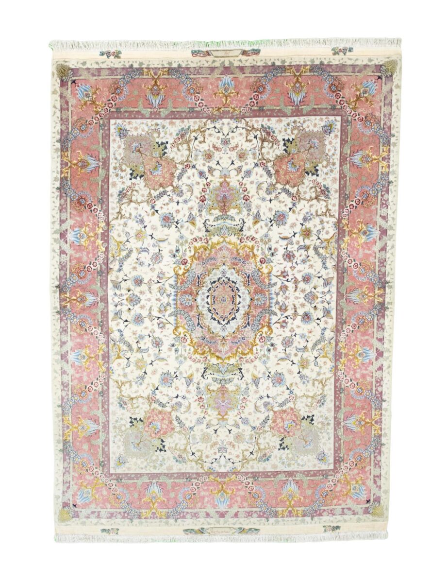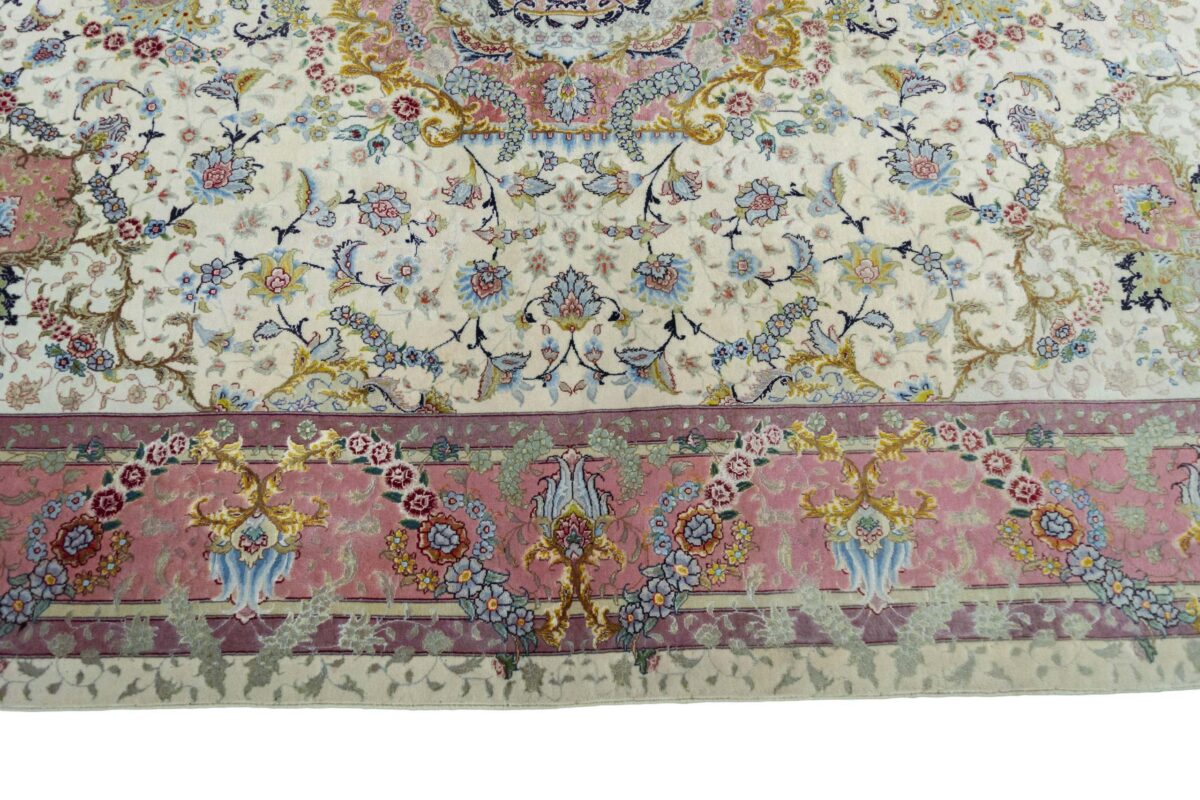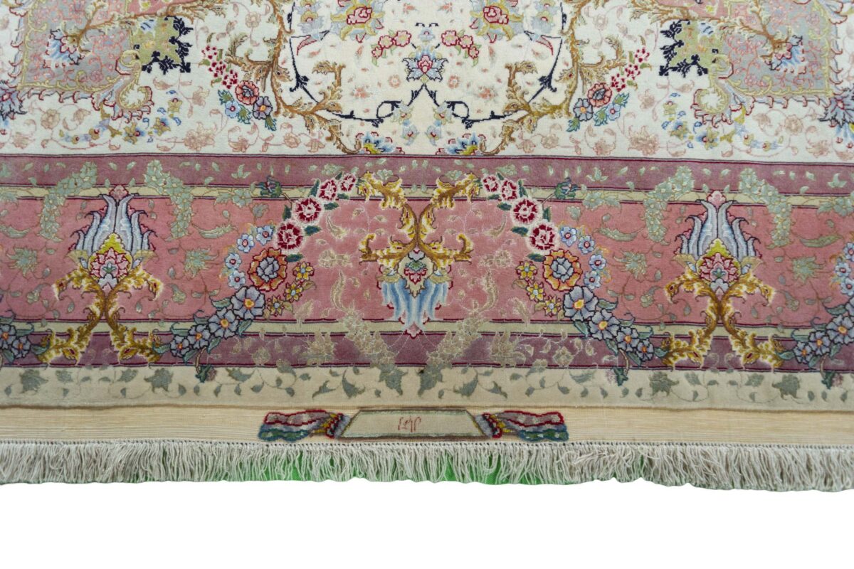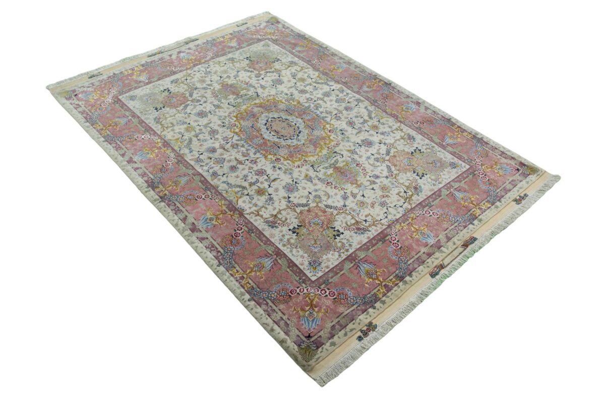 Für die besondere Eleganz des Täbriz-Flors sorgen hervorragende Materialien wie samtig anmutende Korkwolle und glänzende Seidenfäden. Die Knüpfqualität eines Täbriz-Teppichs lässt sich aus der angegebenen Raj-Zahl erschließen – je höher diese ausfällt, umso feiner ist die Knüpfdichte, die eine Million und mehr Knoten pro Quadratmeter erreichen kann. Bei besonders feingeknüpften Qualitäten kommt für die Kette statt des üblichen Baumwollgarns sogar Seide zum Einsatz.