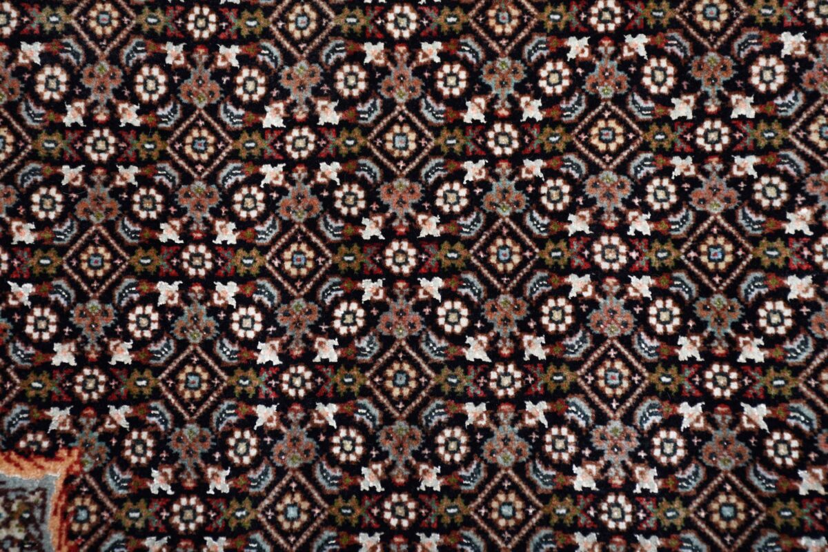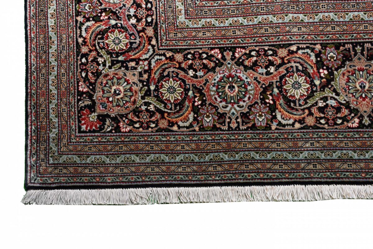 Für die besondere Eleganz des Täbriz-Flors sorgen hervorragende Materialien wie samtig anmutende Korkwolle und glänzende Seidenfäden. Die Knüpfqualität eines Täbriz-Teppichs lässt sich aus der angegebenen Raj-Zahl erschließen – je höher diese ausfällt, umso feiner ist die Knüpfdichte, die eine Million und mehr Knoten pro Quadratmeter erreichen kann. Bei besonders feingeknüpften Qualitäten kommt für die Kette statt des üblichen Baumwollgarns sogar Seide zum Einsatz.