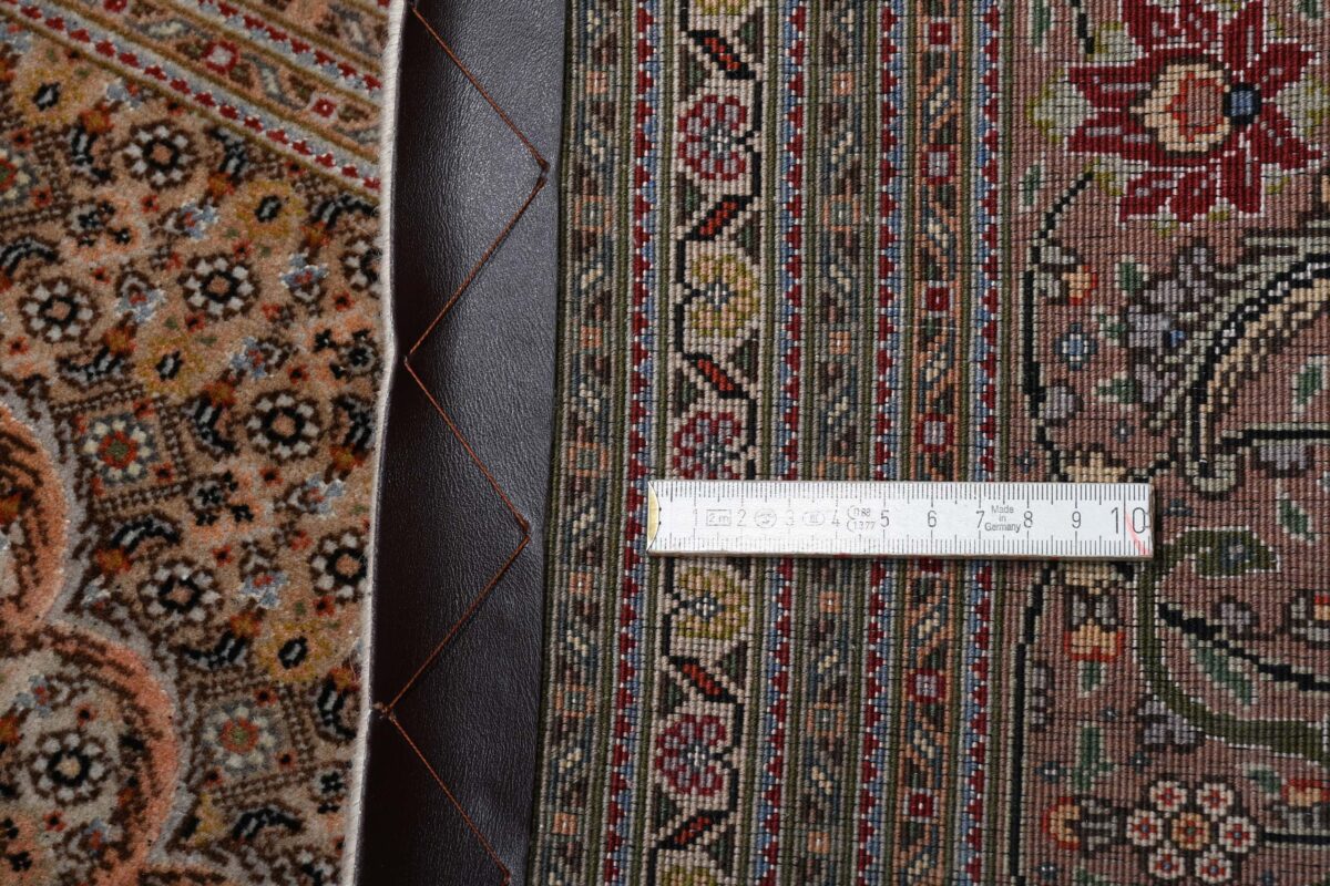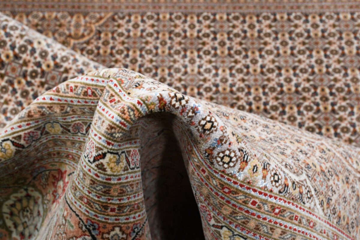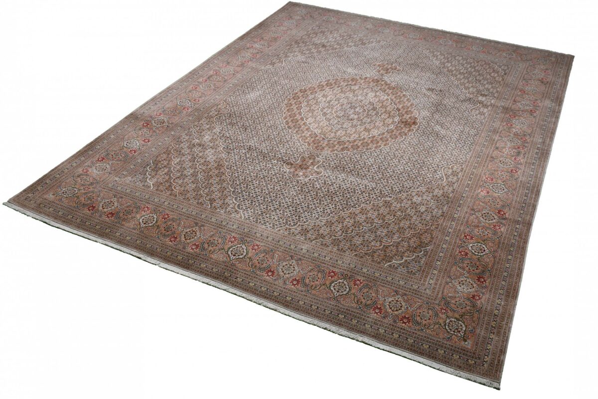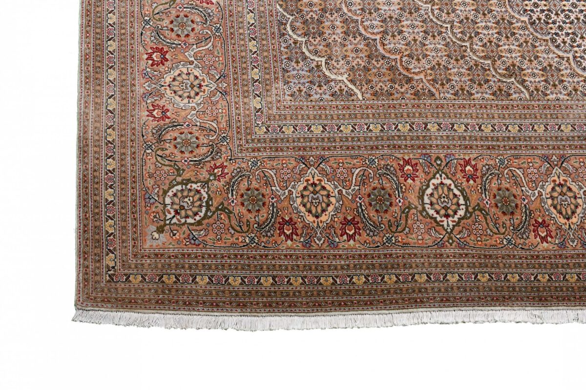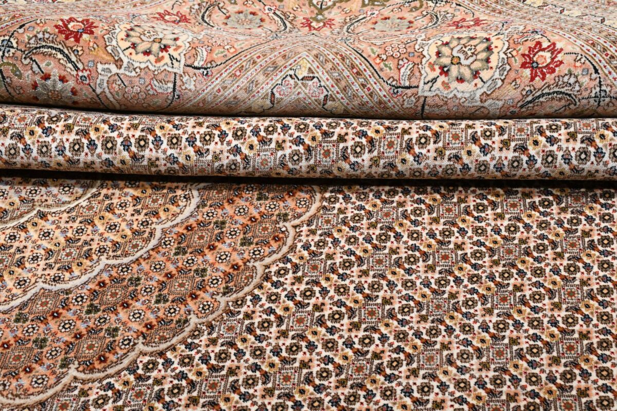 Für die besondere Eleganz des Täbriz-Flors sorgen hervorragende Materialien wie samtig anmutende Korkwolle und glänzende Seidenfäden. Die Knüpfqualität eines Täbriz-Teppichs lässt sich aus der angegebenen Raj-Zahl erschließen – je höher diese ausfällt, umso feiner ist die Knüpfdichte, die eine Million und mehr Knoten pro Quadratmeter erreichen kann. Bei besonders feingeknüpften Qualitäten kommt für die Kette statt des üblichen Baumwollgarns sogar Seide zum Einsatz.