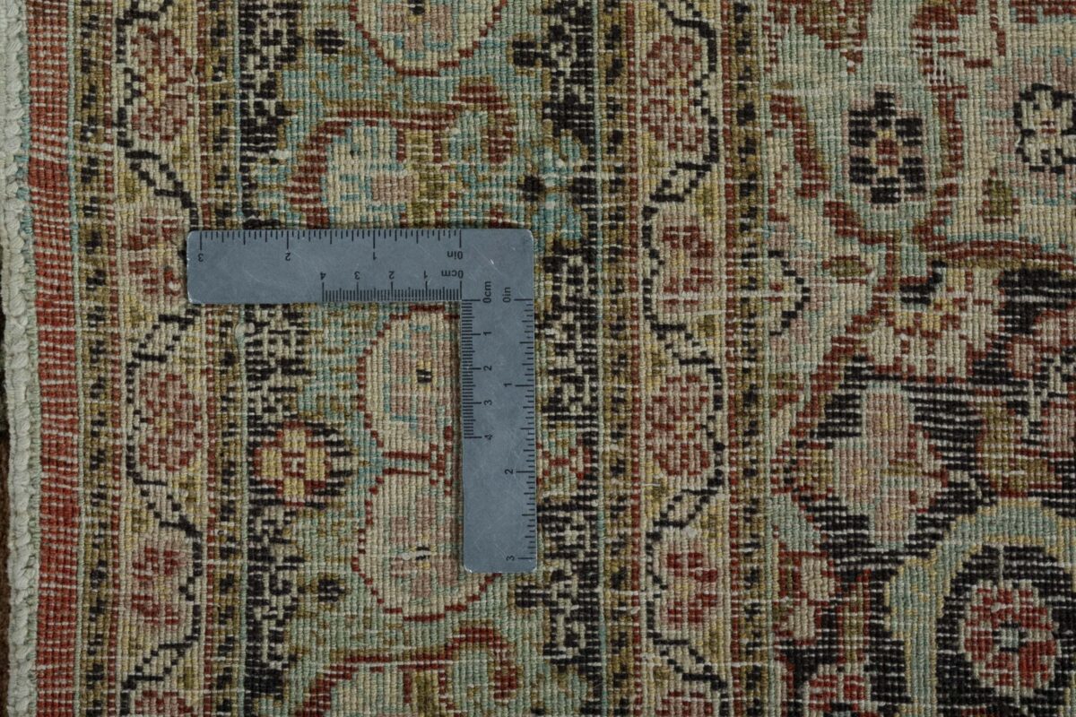 Für die besondere Eleganz des Täbriz-Flors sorgen hervorragende Materialien wie samtig anmutende Korkwolle und glänzende Seidenfäden. Die Knüpfqualität eines Täbriz-Teppichs lässt sich aus der angegebenen Raj-Zahl erschließen – je höher diese ausfällt, umso feiner ist die Knüpfdichte, die eine Million und mehr Knoten pro Quadratmeter erreichen kann. Bei besonders feingeknüpften Qualitäten kommt für die Kette statt des üblichen Baumwollgarns sogar Seide zum Einsatz.