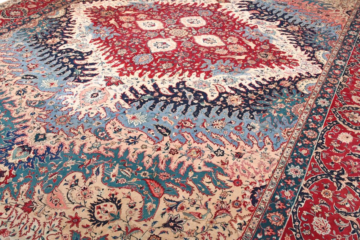 Für die besondere Eleganz des Täbriz-Flors sorgen hervorragende Materialien wie samtig anmutende Korkwolle und glänzende Seidenfäden. Die Knüpfqualität eines Täbriz-Teppichs lässt sich aus der angegebenen Raj-Zahl erschließen – je höher diese ausfällt, umso feiner ist die Knüpfdichte, die eine Million und mehr Knoten pro Quadratmeter erreichen kann. Bei besonders feingeknüpften Qualitäten kommt für die Kette statt des üblichen Baumwollgarns sogar Seide zum Einsatz.