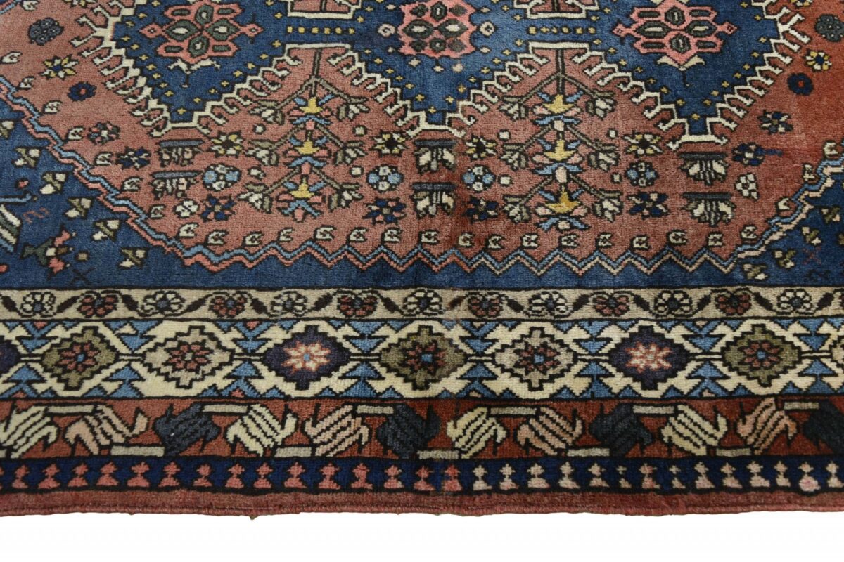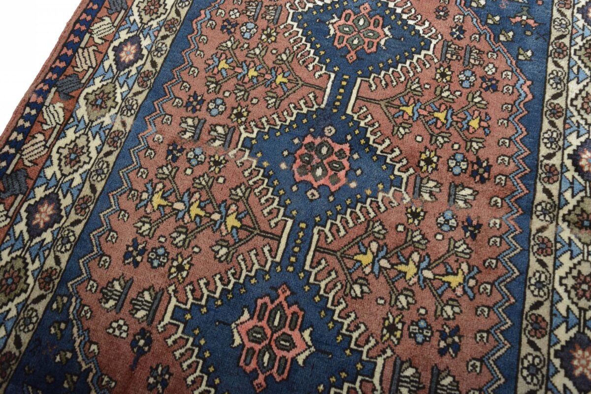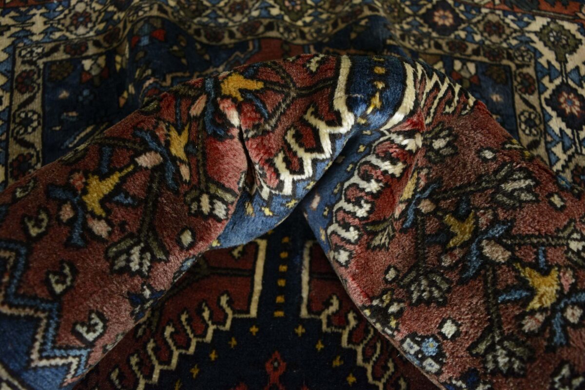 Ein traditioneller Yalameh-Teppich erstrahlt in kräftigen Rot- und Blautönen sowie Erdfarben und lässt sich leicht an seinem typischen Rauten-Muster erkennen. Als Basisstruktur findet sich häufig das mittige „She-hoze“-Motiv mit mehreren, in einer Linie angeordneten Rauten. Beliebt ist auch die Anordnung zahlreicher Yalameh-Rauten in einem Raster aus Quadraten. Achten Sie auch auf die fantasievolle Füllung der Grundfelder: Die sehr hübsch stilisierten Tier- und Menschenfiguren, Sternsymbole und Rosetten bieten dem Betrachter ein wahres Genusserlebnis!