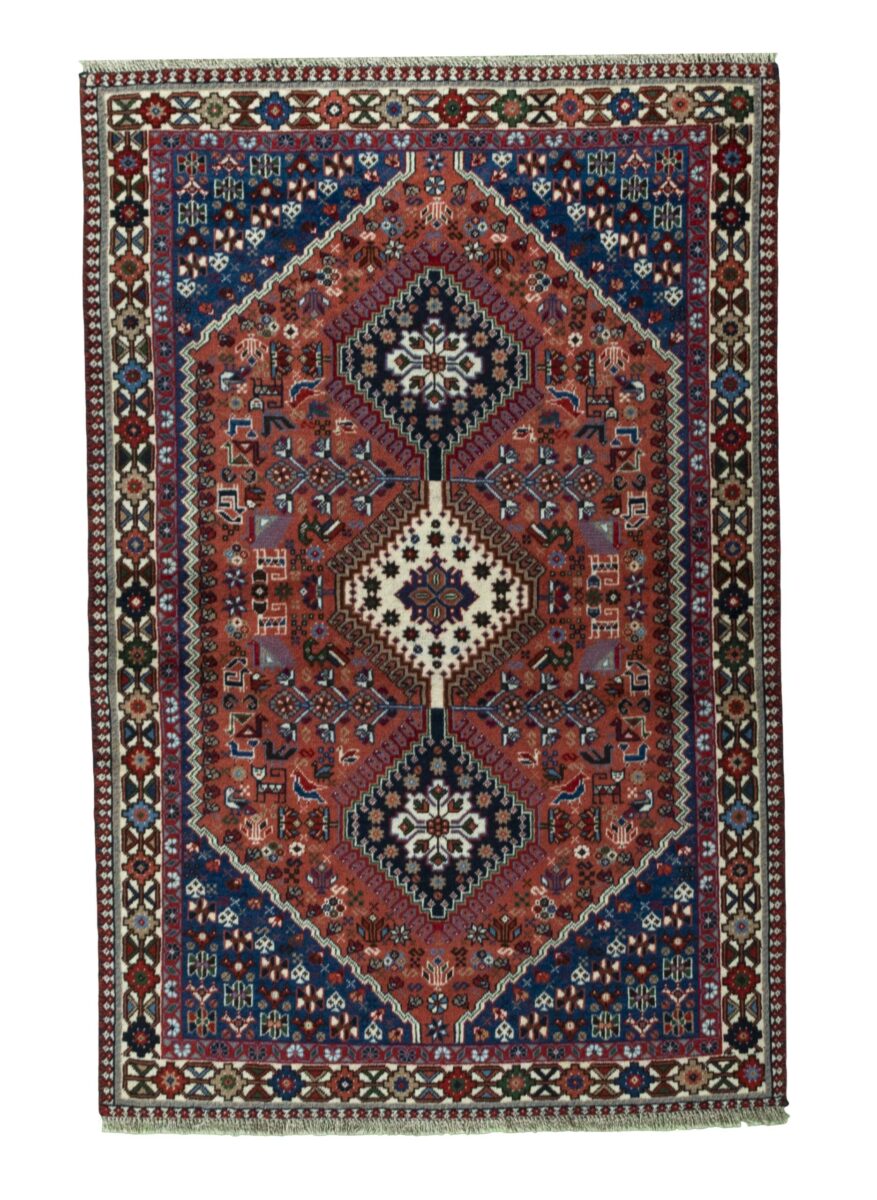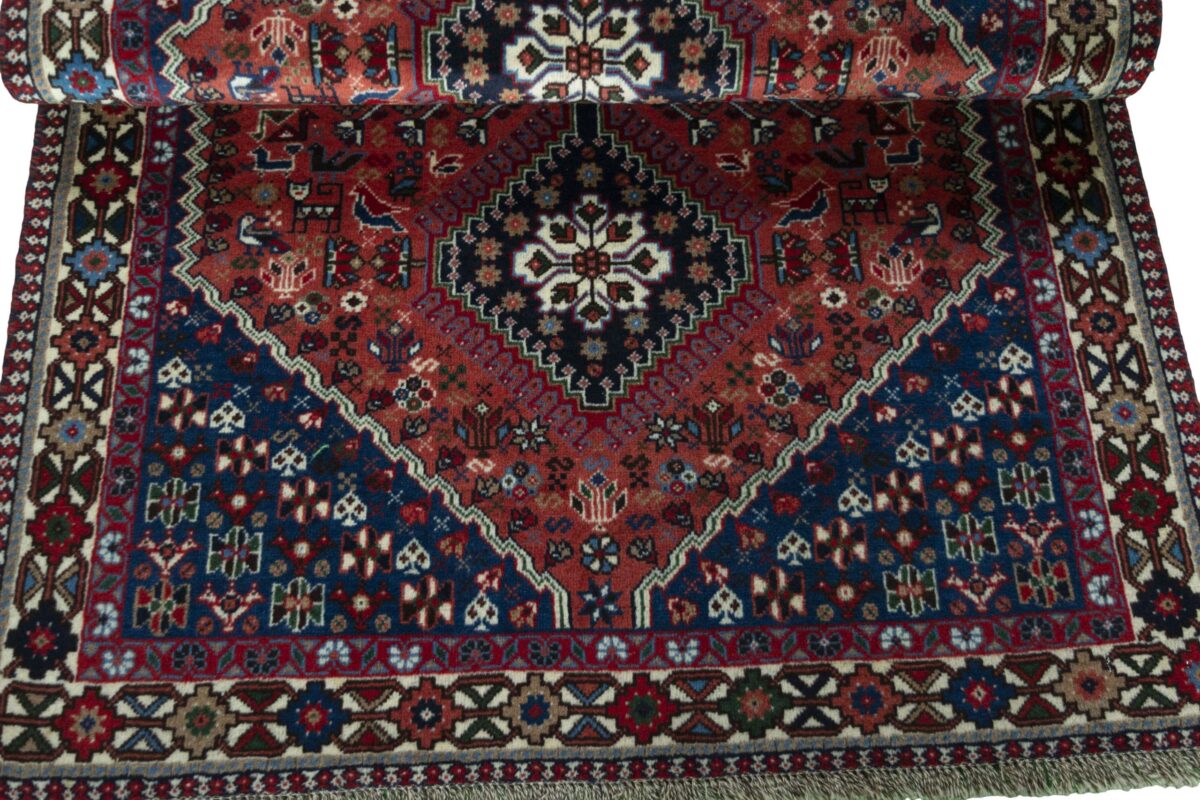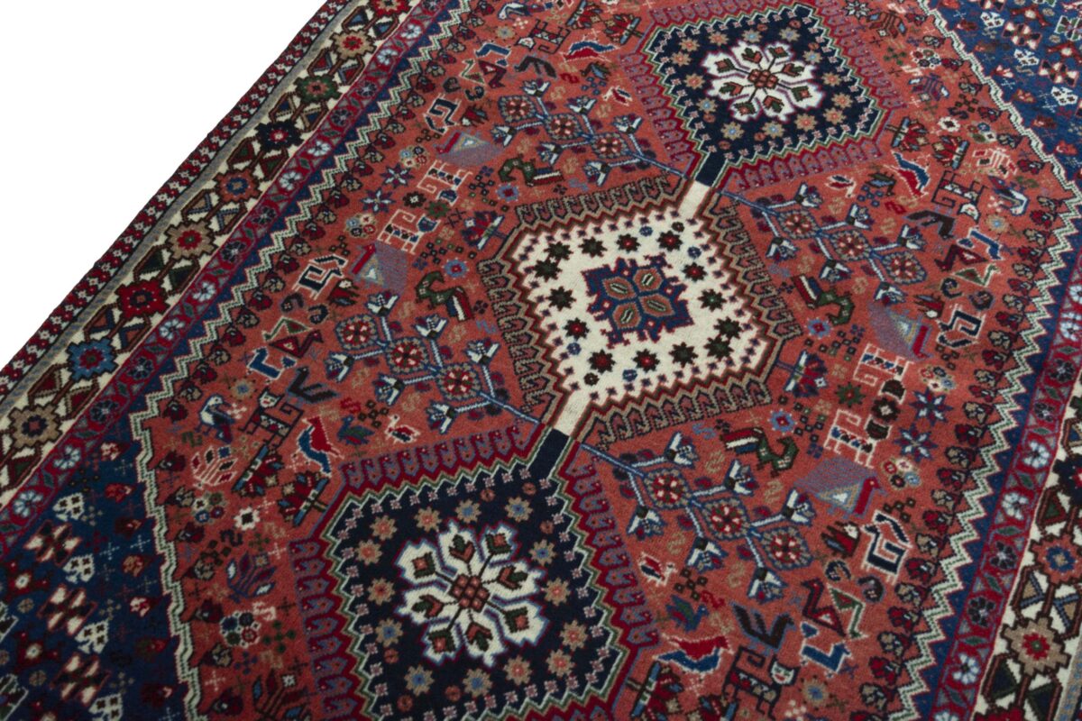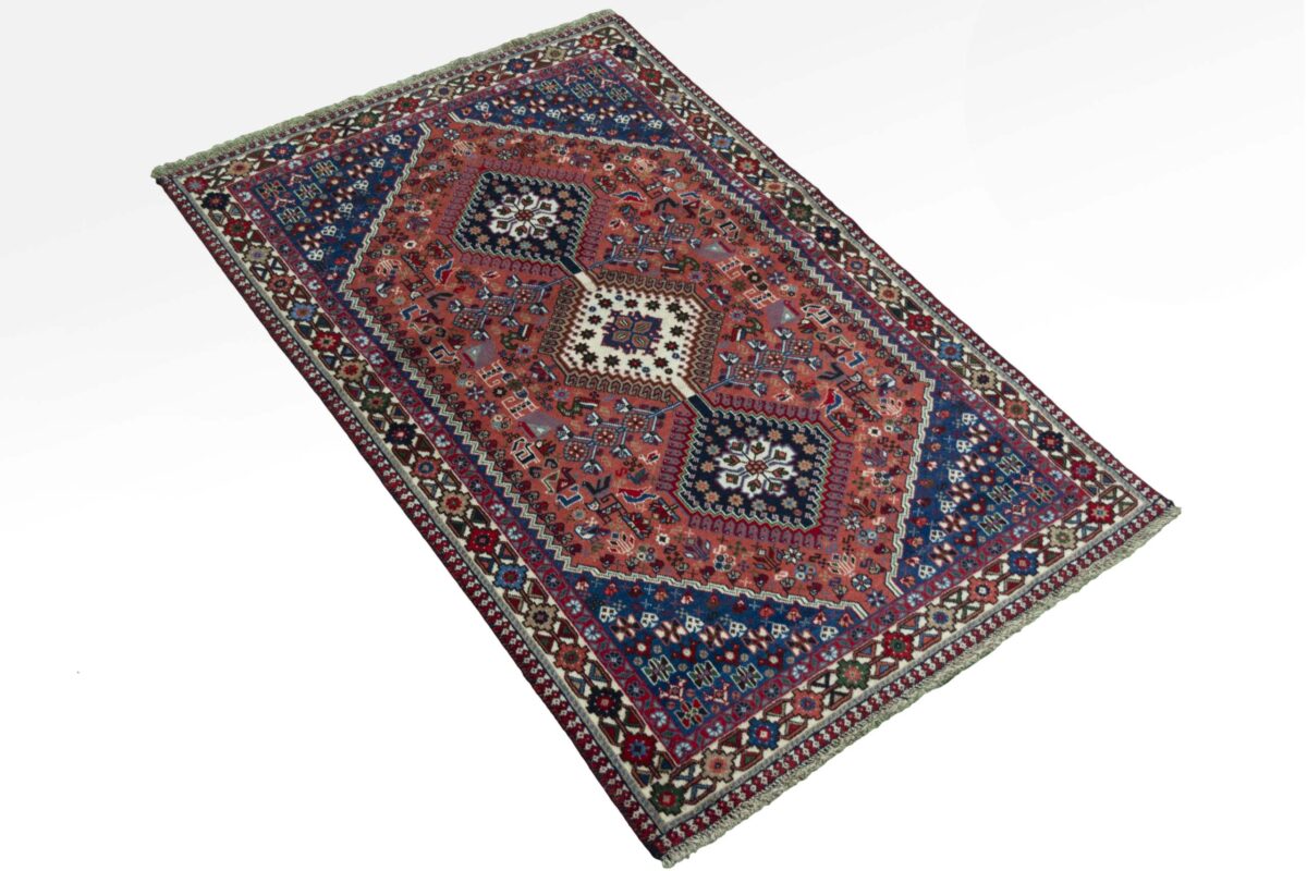 Ein traditioneller Yalameh-Teppich erstrahlt in kräftigen Rot- und Blautönen sowie Erdfarben und lässt sich leicht an seinem typischen Rauten-Muster erkennen. Als Basisstruktur findet sich häufig das mittige „She-hoze“-Motiv mit mehreren, in einer Linie angeordneten Rauten. Beliebt ist auch die Anordnung zahlreicher Yalameh-Rauten in einem Raster aus Quadraten. Achten Sie auch auf die fantasievolle Füllung der Grundfelder: Die sehr hübsch stilisierten Tier- und Menschenfiguren, Sternsymbole und Rosetten bieten dem Betrachter ein wahres Genusserlebnis!