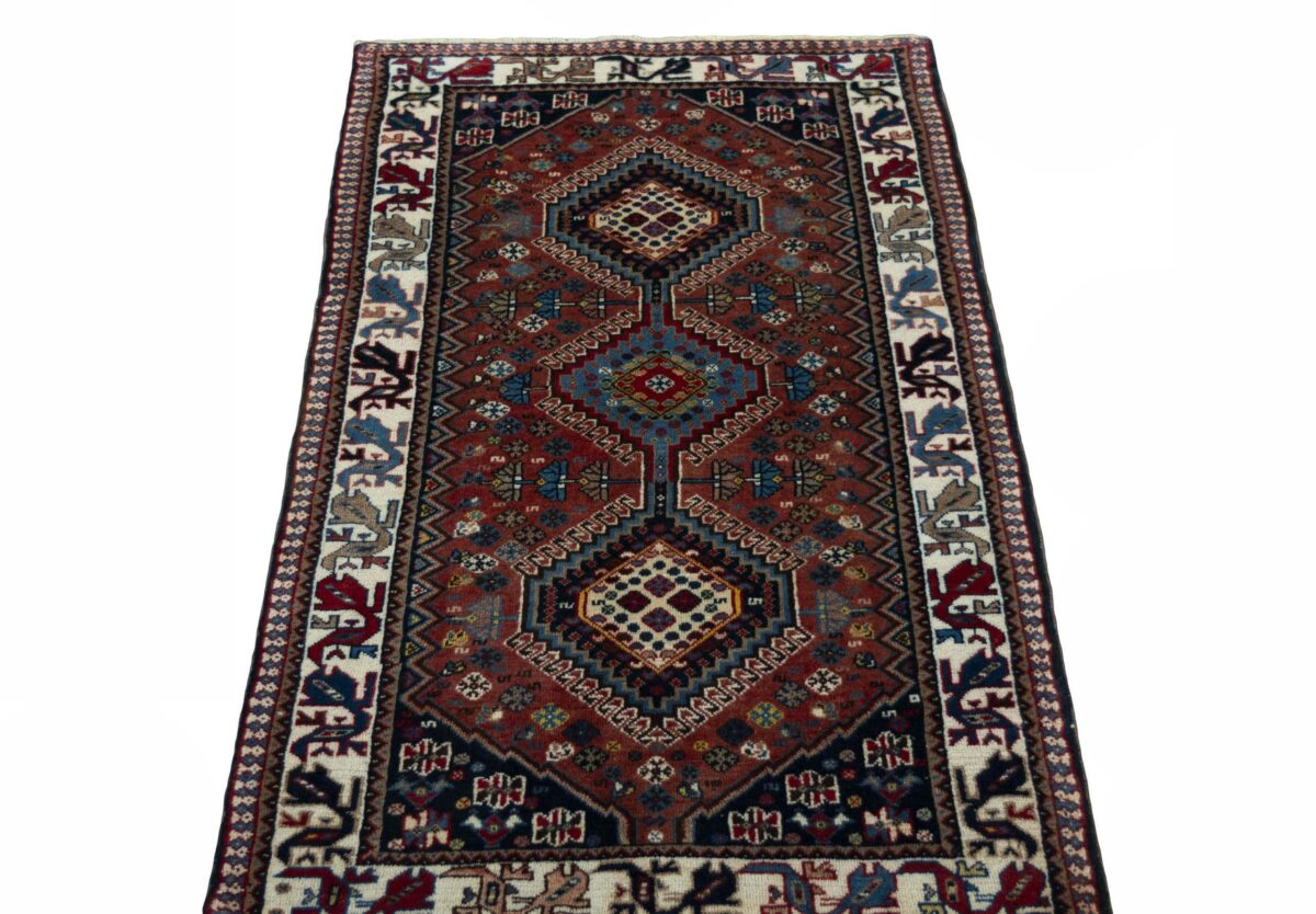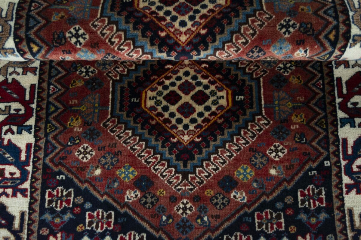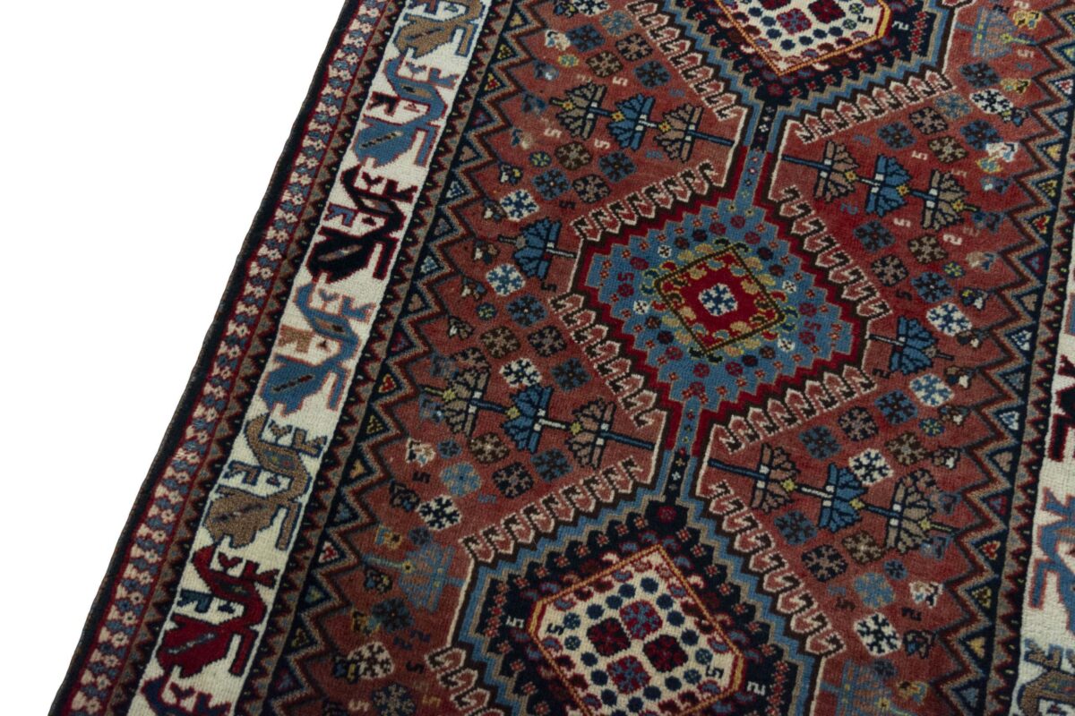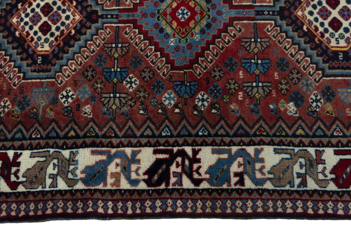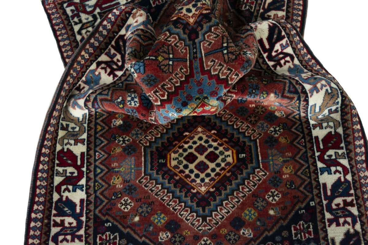 Ein traditioneller Yalameh-Teppich erstrahlt in kräftigen Rot- und Blautönen sowie Erdfarben und lässt sich leicht an seinem typischen Rauten-Muster erkennen. Als Basisstruktur findet sich häufig das mittige „She-hoze“-Motiv mit mehreren, in einer Linie angeordneten Rauten. Beliebt ist auch die Anordnung zahlreicher Yalameh-Rauten in einem Raster aus Quadraten. Achten Sie auch auf die fantasievolle Füllung der Grundfelder: Die sehr hübsch stilisierten Tier- und Menschenfiguren, Sternsymbole und Rosetten bieten dem Betrachter ein wahres Genusserlebnis!