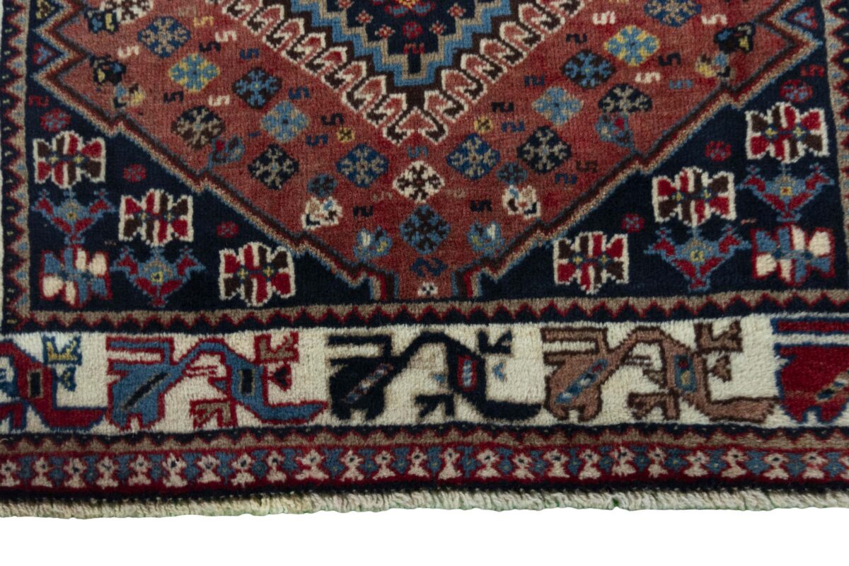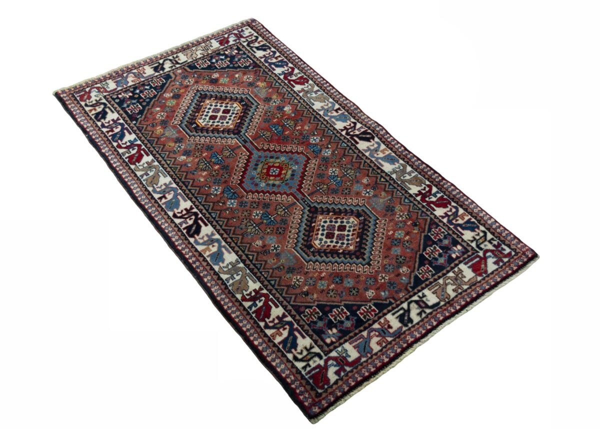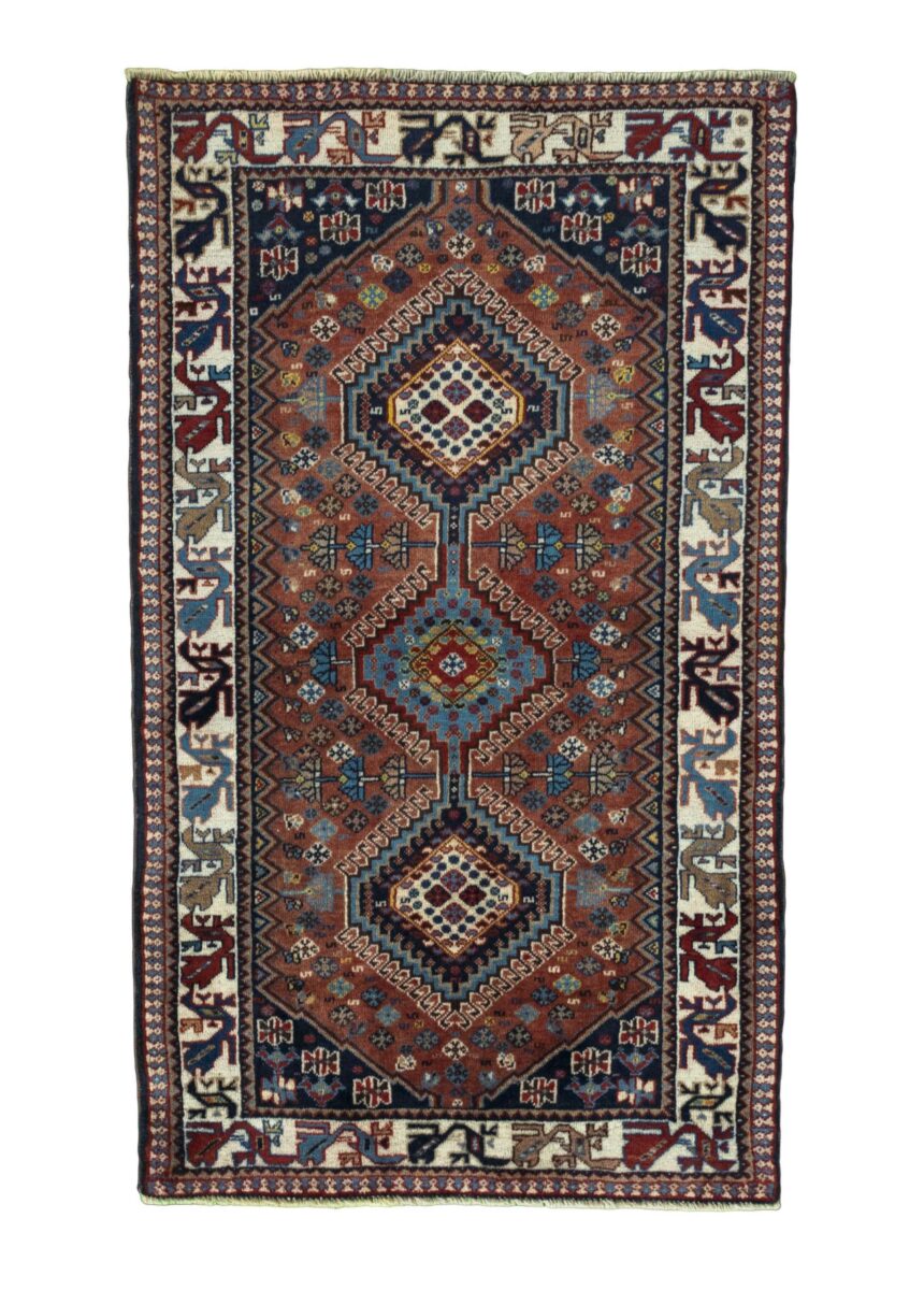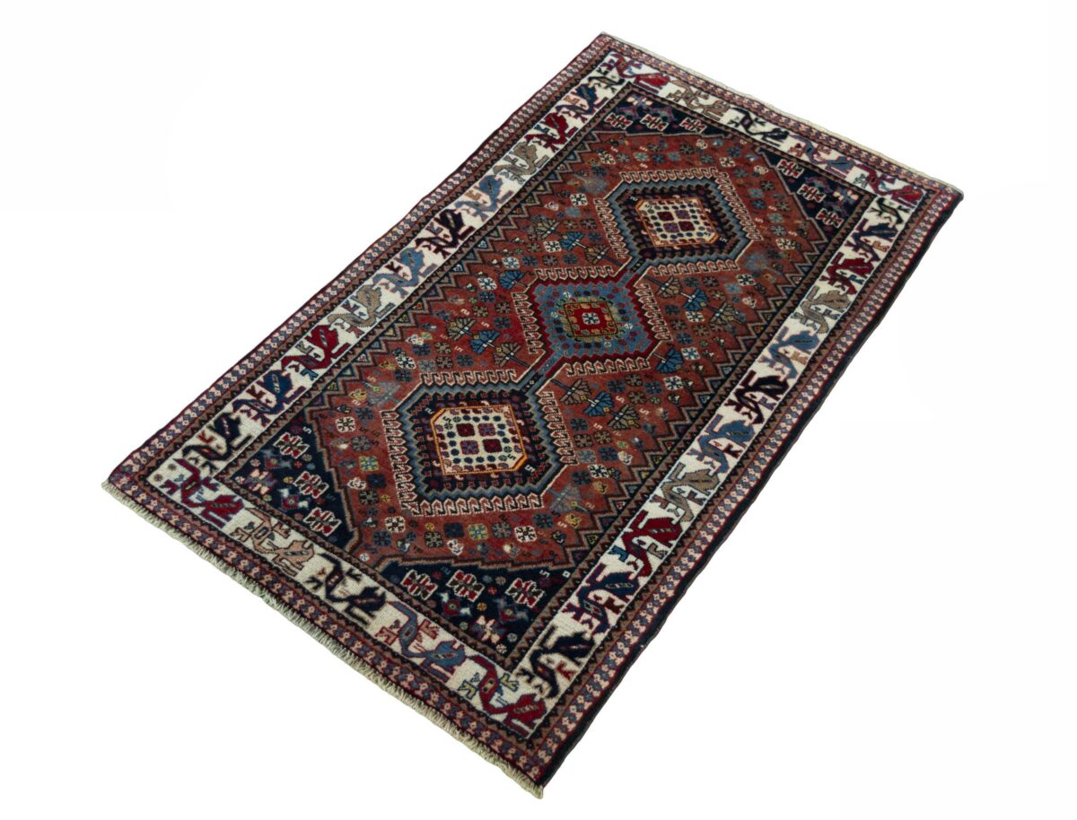 Ein traditioneller Yalameh-Teppich erstrahlt in kräftigen Rot- und Blautönen sowie Erdfarben und lässt sich leicht an seinem typischen Rauten-Muster erkennen. Als Basisstruktur findet sich häufig das mittige „She-hoze“-Motiv mit mehreren, in einer Linie angeordneten Rauten. Beliebt ist auch die Anordnung zahlreicher Yalameh-Rauten in einem Raster aus Quadraten. Achten Sie auch auf die fantasievolle Füllung der Grundfelder: Die sehr hübsch stilisierten Tier- und Menschenfiguren, Sternsymbole und Rosetten bieten dem Betrachter ein wahres Genusserlebnis!